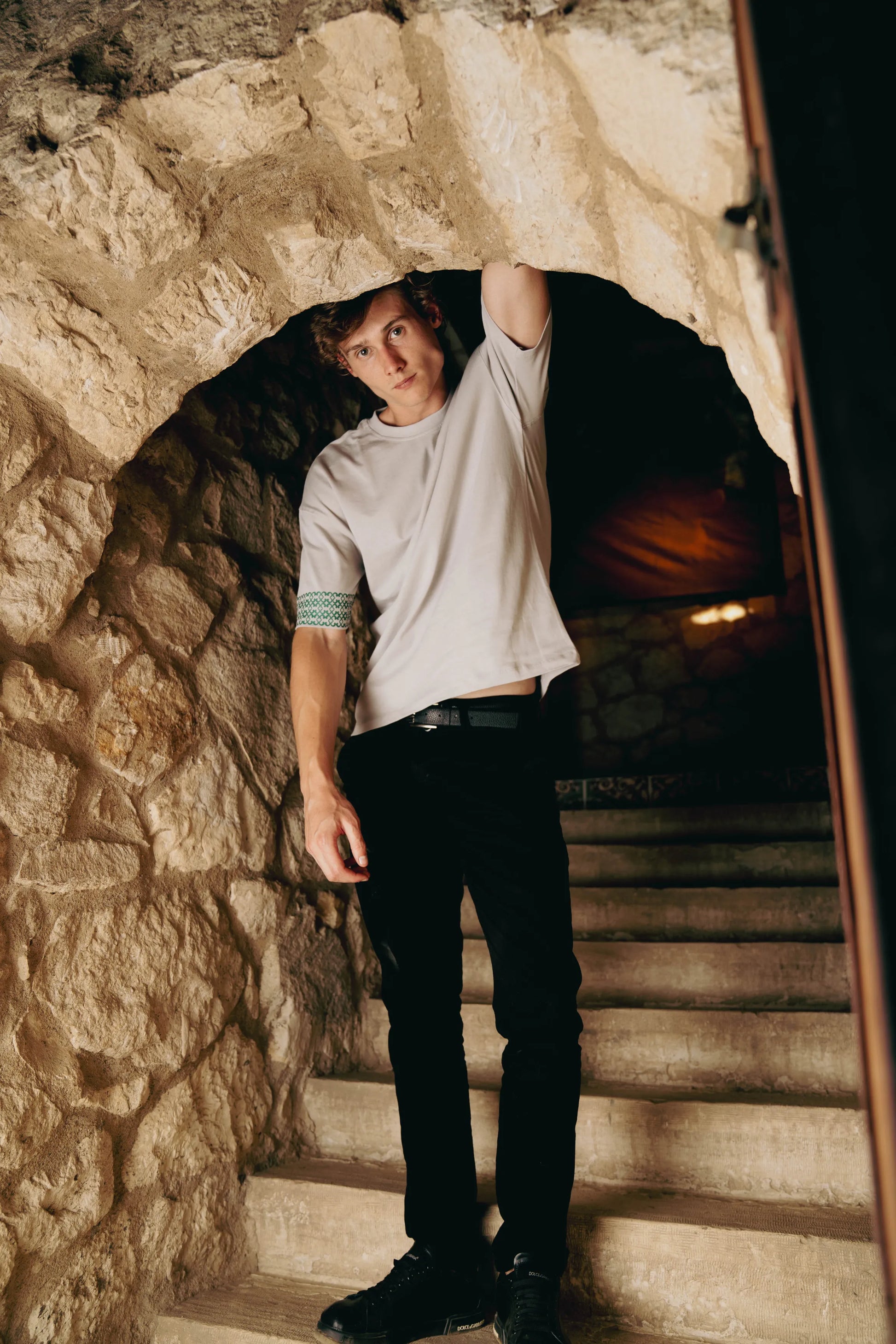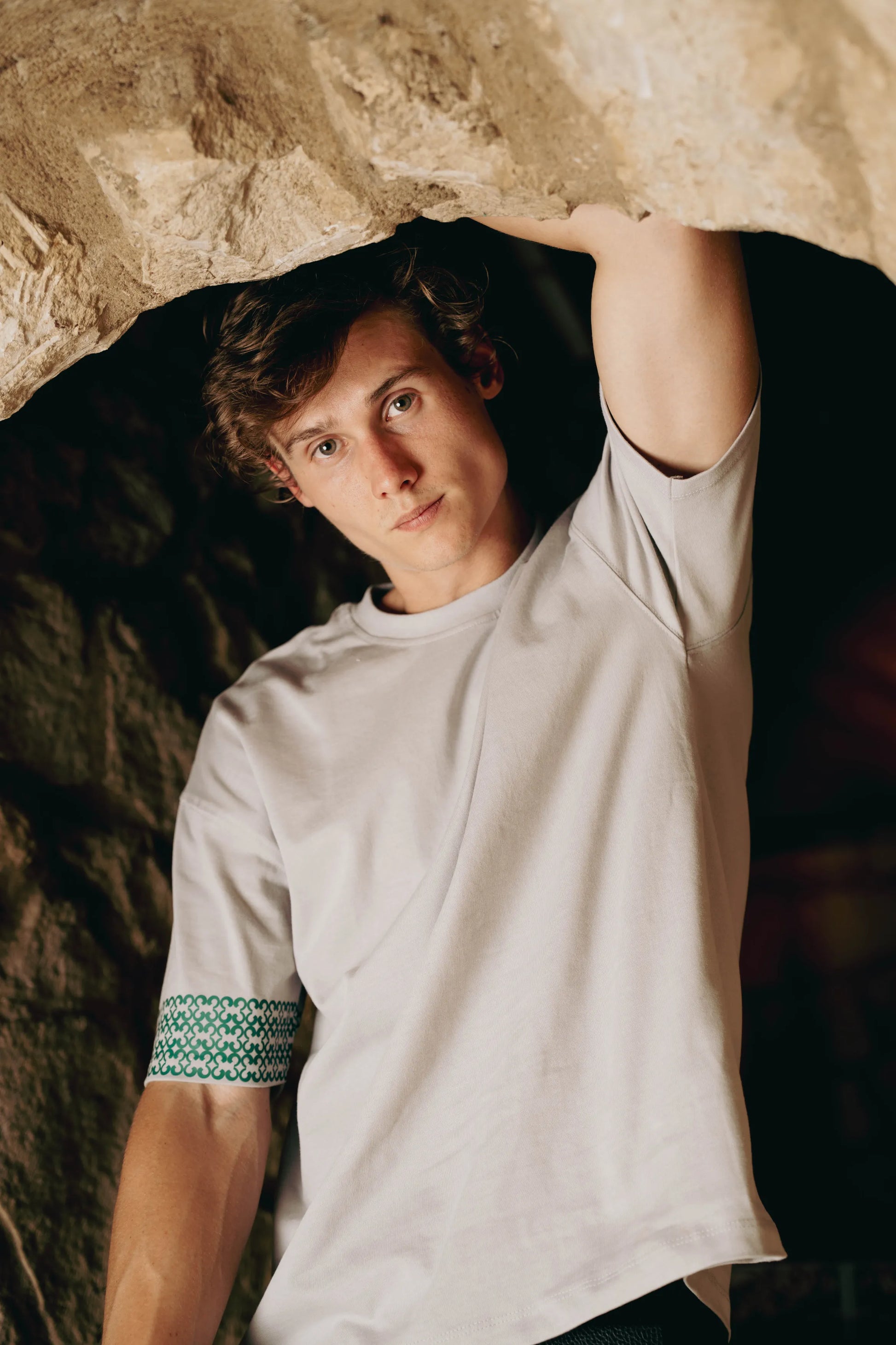 Oversized tee with all-around sleeve pattern and small chest logo on premium cotton.